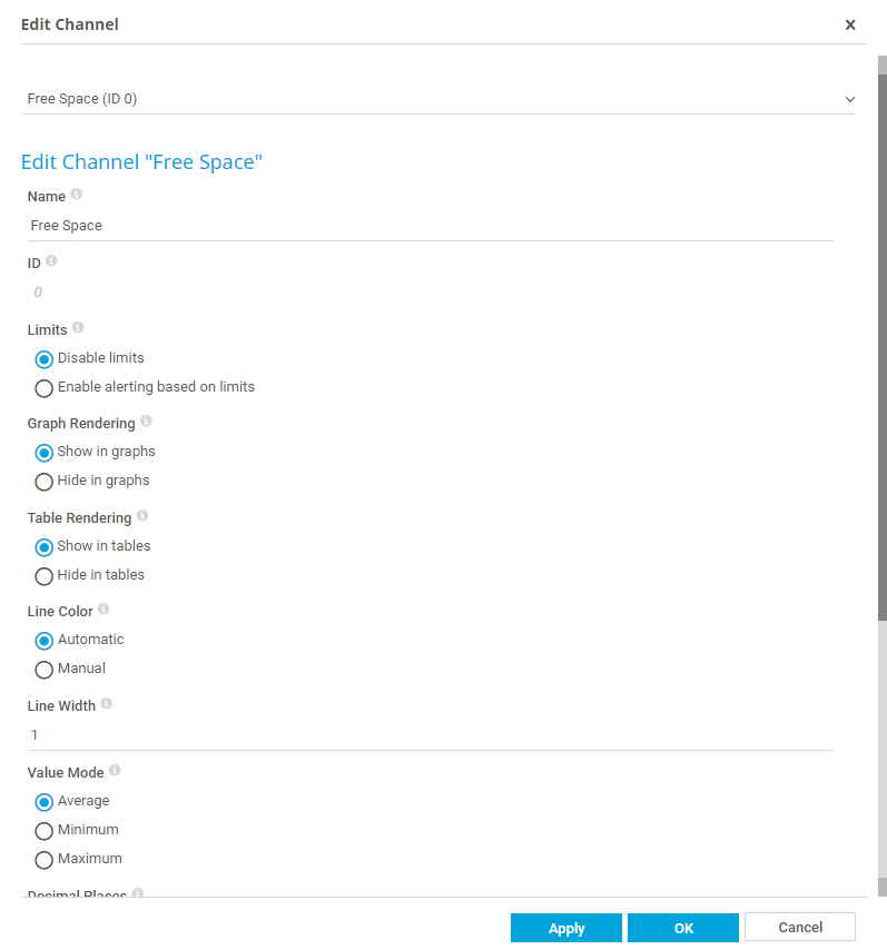 i_round_blueClick OK to save your settings and to close the settings window. Click Apply to save the changed settings while the Edit Channel window remains open, for example if you want to change the settings of other channels of the current sensor as well. You can select a different channel via the dropdown list above the settings. You can close the settings window without saving by clicking Cancel.