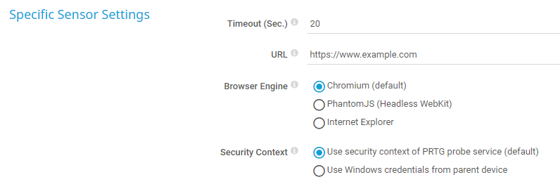 • Use security context of PRTG probe service (default): Run the browser engine under the same Windows user account that the probe system runs under. By default, this is the local Windows "system" user account.